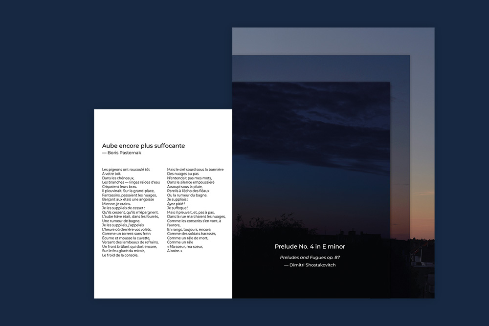 To illustrate this journey from darkness to light, I asked my regular photographer (thanks to him) to take pictures of the dawn from the office of our flat (yes, at the end of spring, the first light appears around 3:30... fortunately we can program the camera!) I had to find a nice booklet format that would allow me to see the changes in the sky's luminosity simultaneously. I opted for a 'staircase' format which allows to glimpse, even when closed, the three successive skies associated with the three musical works. It is a format that requires precise cuts and nerves of steel to make about fifteen copies!
